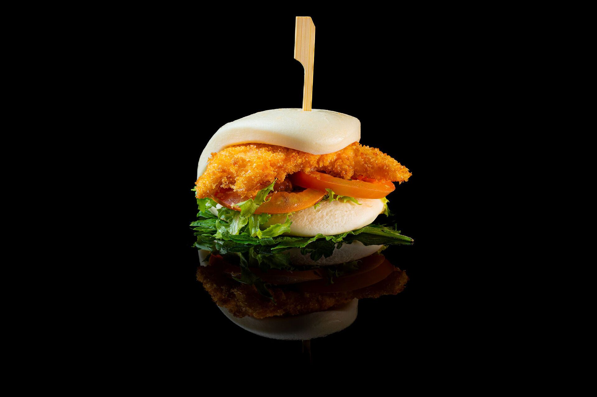 Pane cinese, verdure miste, salmone fritto croccante, surimi con salsa Teriyaki