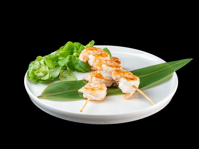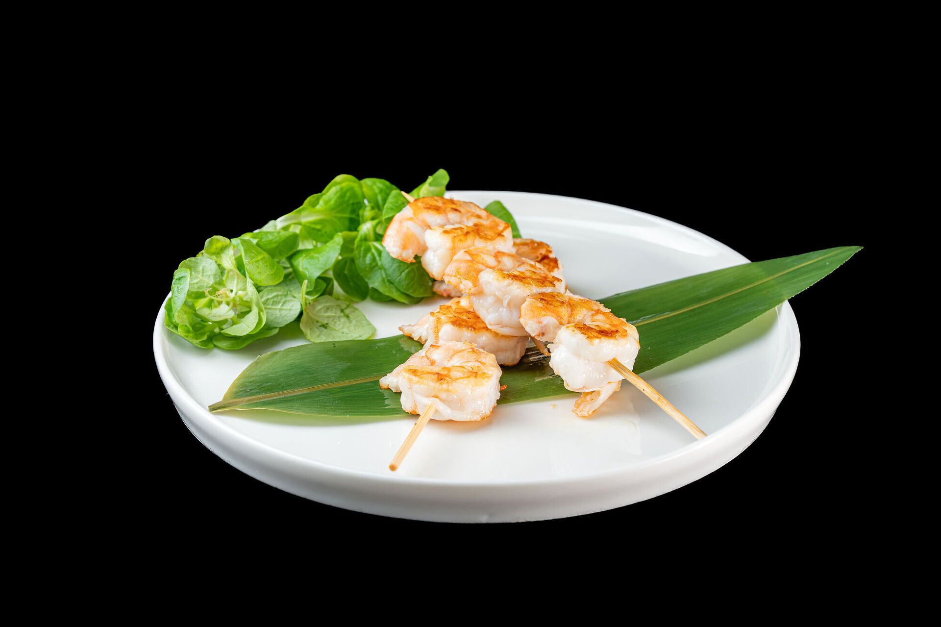 Spiedini di gamberi (mazzancolle) alla griglia con salsa teriyaki