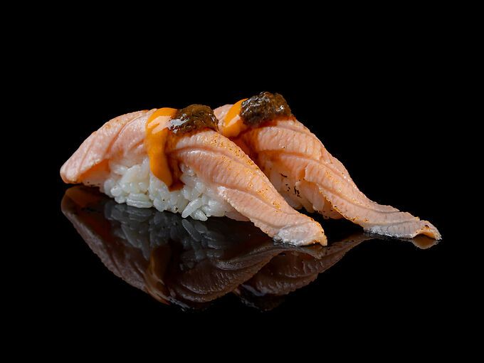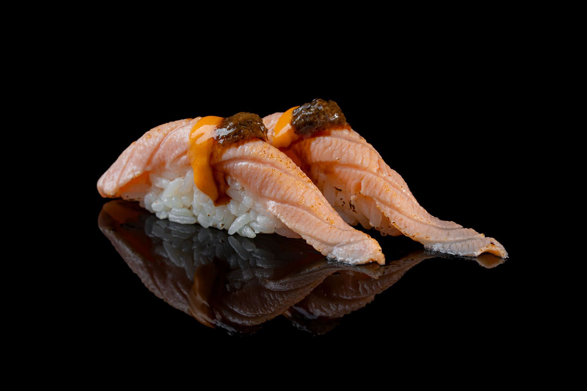 Salmone scottato, salsa tartufo e salsa Teriyaki