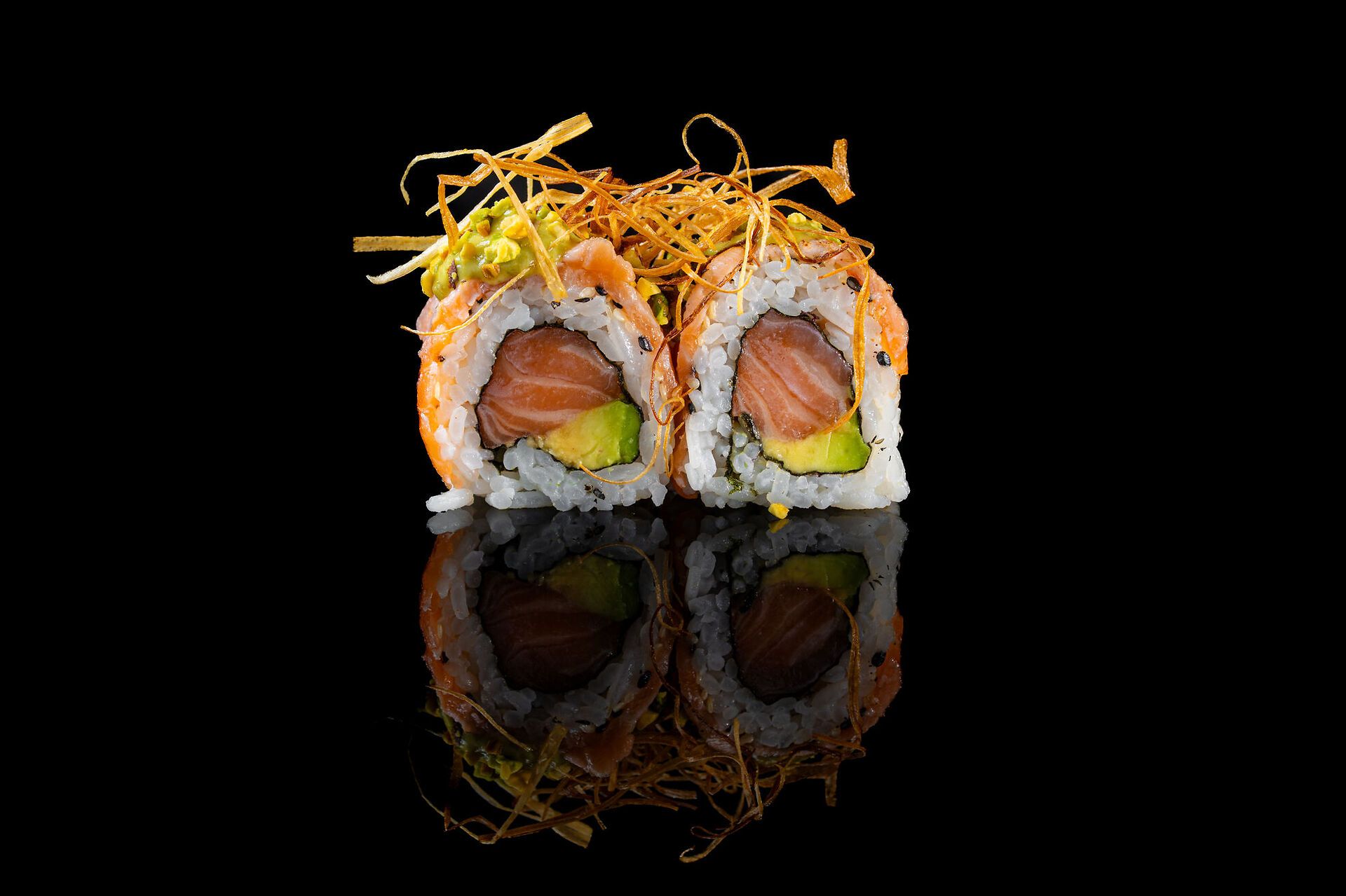 Salmone, salmone scottato, avocado, salsa avocado, pistachio, porri fritti e sesamo